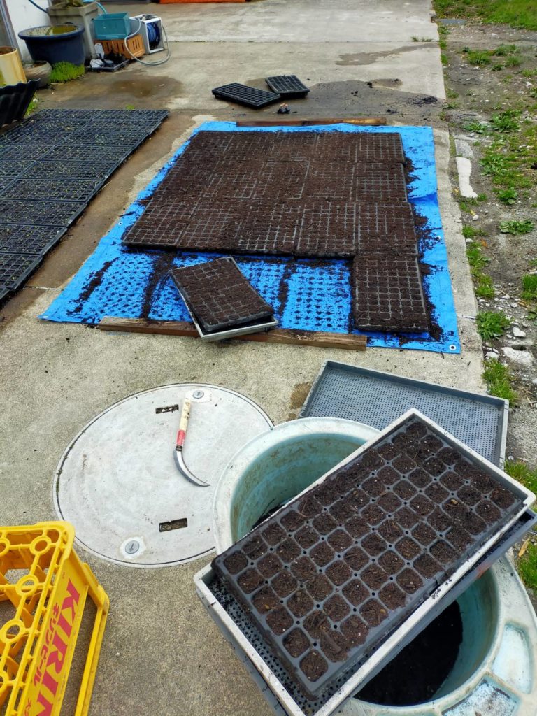 場所によってやりかたは様々ですが、うちではパレットで苗を作ります。